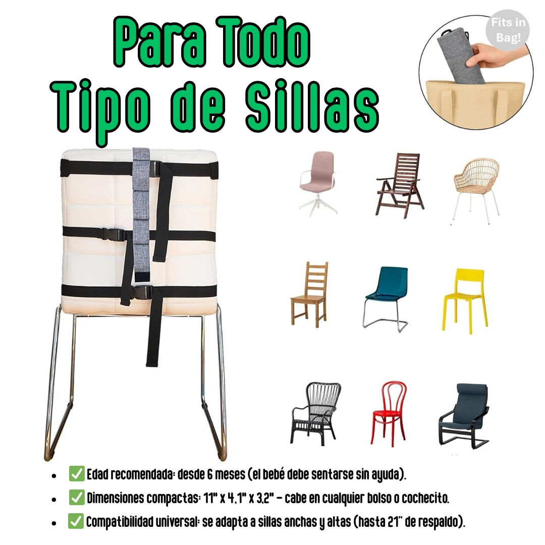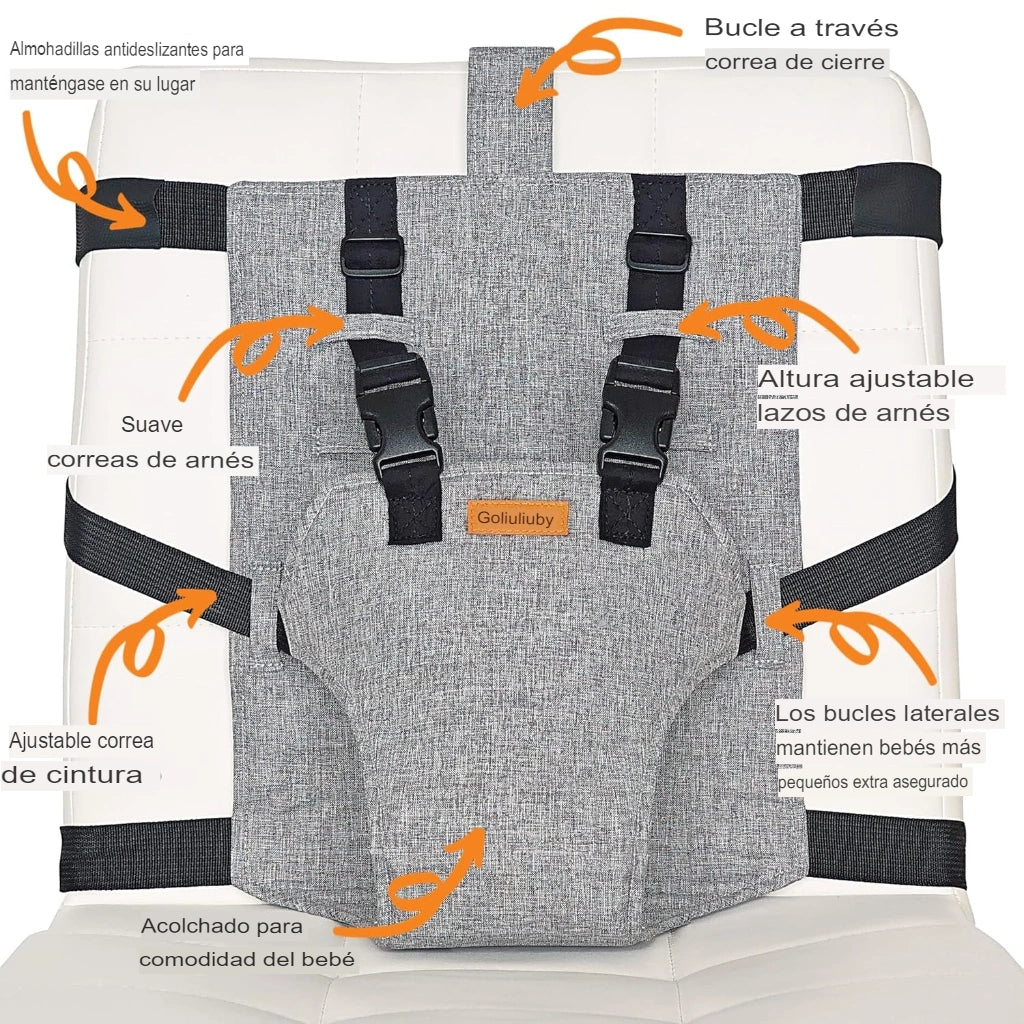 Colocamos la Trona de Bolsillo hecha de algodón, la fijamos a la silla con sus 5 puntos, graduando al tamaño del Bebe, Fácil de limpiar, Ideal para viajes y Lavable a máquina.